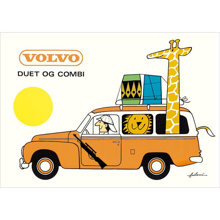 【デザイン】作品は1959年に描かれました。この大物ハンターは、ライオンとキリンを倒す銃を下ろし、彼の真新しくて非常に広々とした安全なボルボのドライブに誘いました。