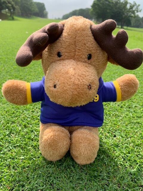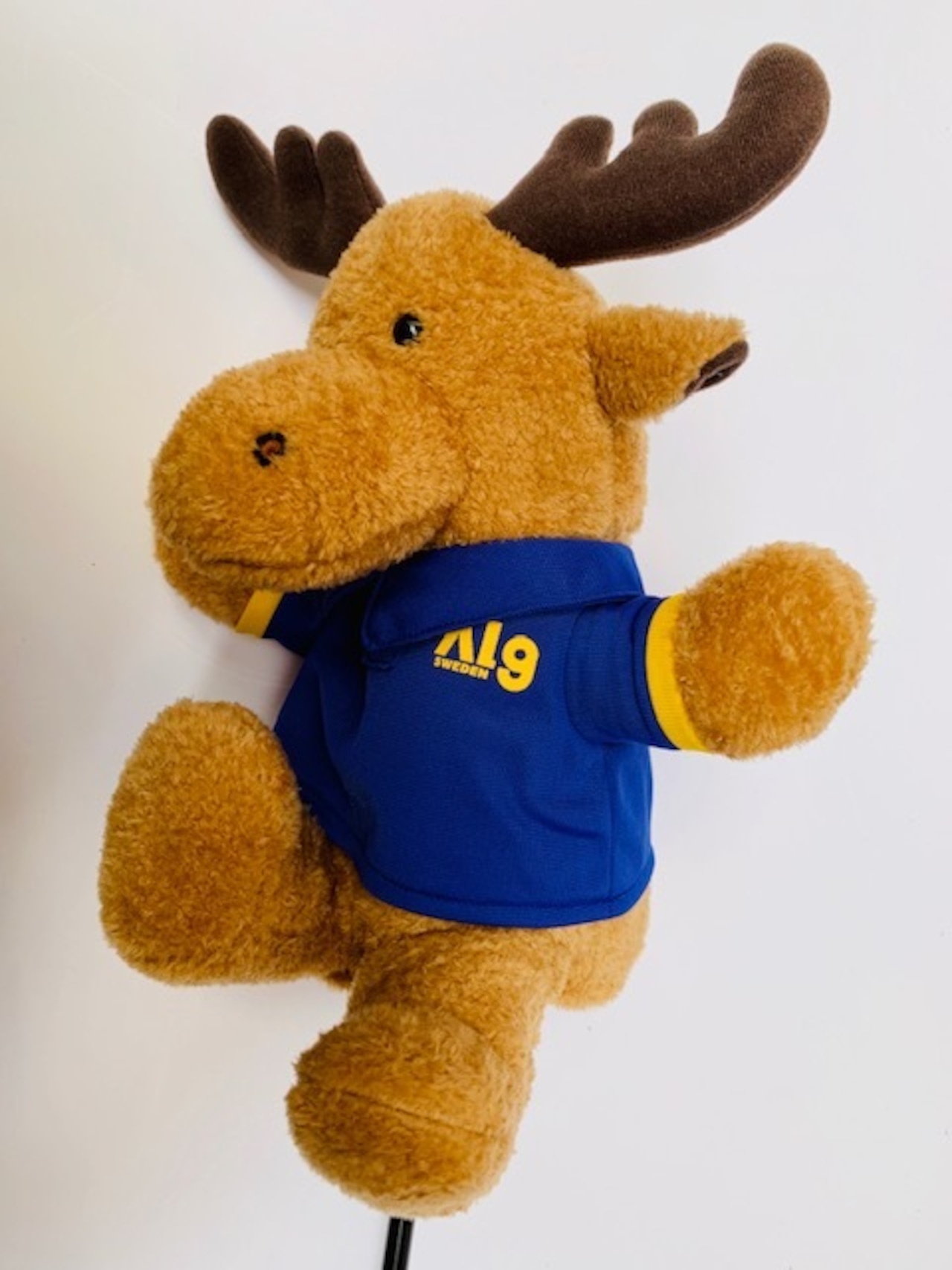 弊社オリジナルのエルクゴルフアクセサリー。フェアウェイウッド用ヘッドカバー。スウェーデンカラーのポロシャツを着ています。目立ちます!!