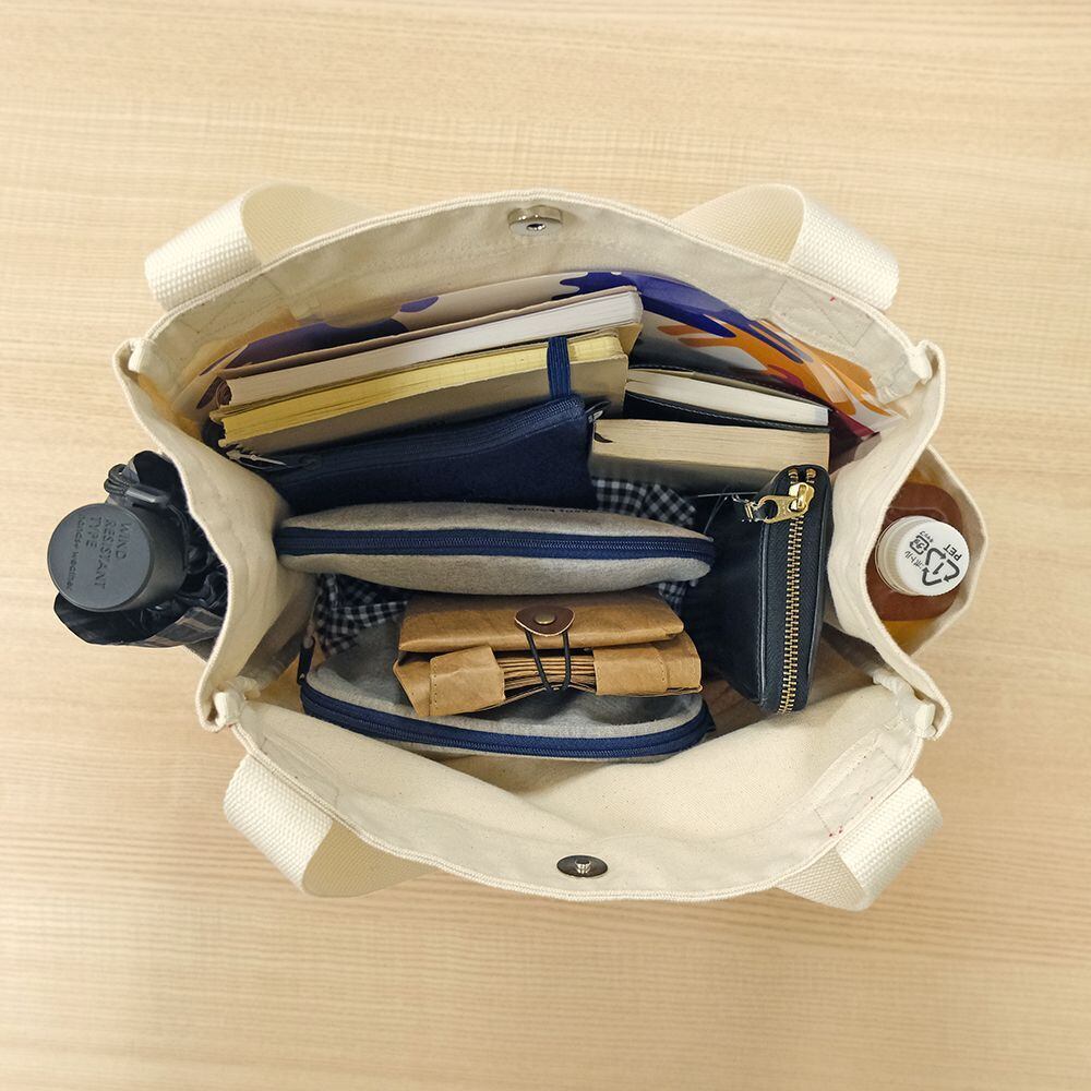 肩掛けタイプのカジュアルトートバッグです。角に丸みがあり、シンプルなカタチが特徴です。サイドポケットにはペットボトルや、折り畳み傘等が入れられます。約W33xH32cm マチ11cm、