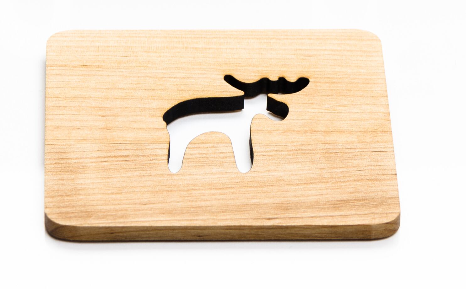 北欧の森でとれる自然素材をハンドメイドで仕上げるスカンジナビスク・ヘムスロイド。アルダー素材のコースター4枚入り。エルクがくり抜かれています。10x10cm 透明アクリルケース入り
